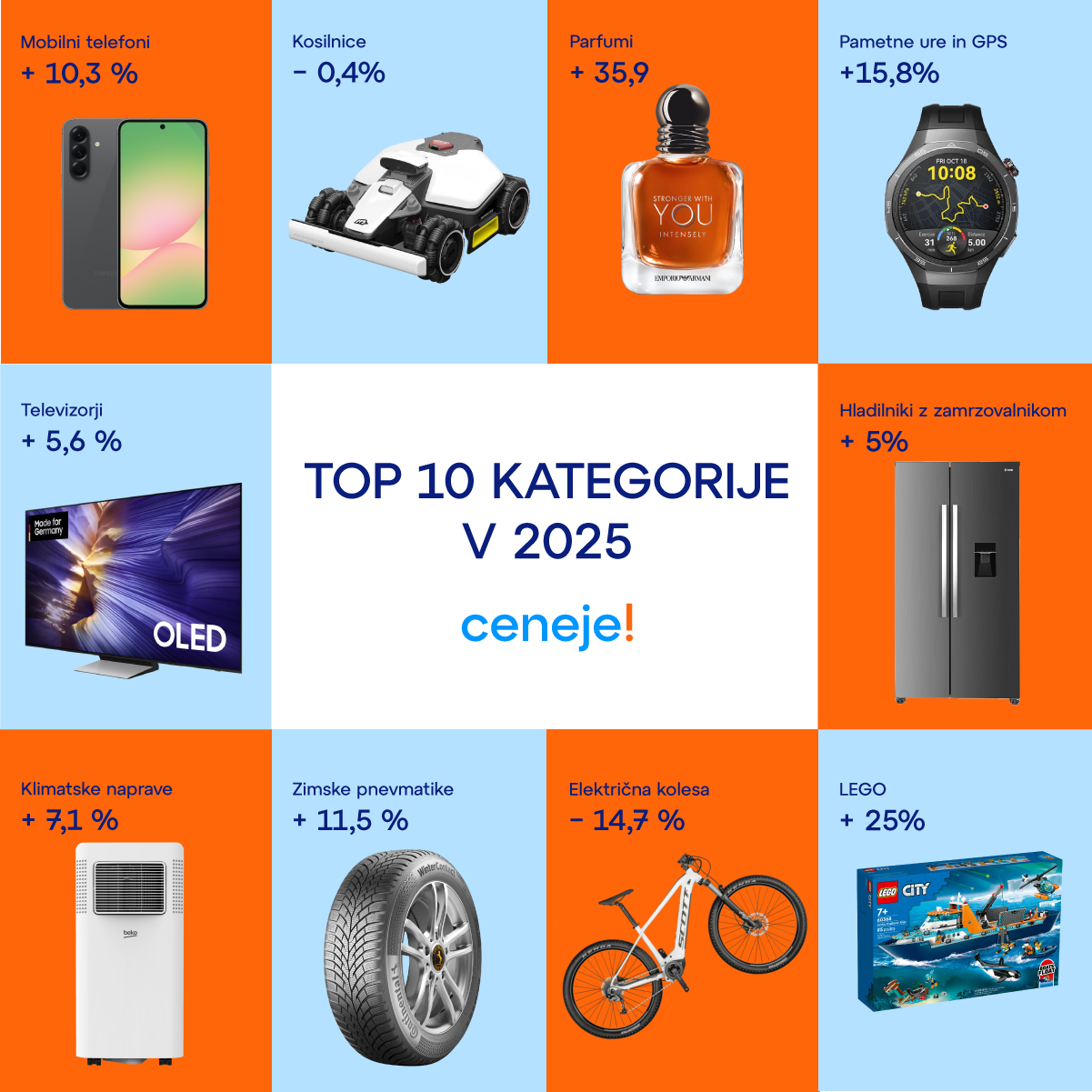 Podatki iz vodilne slovenske platforme za primerjavo cen Ceneje.si kažejo, da je bila leta 2025 najbolj obiskana kategorija Mobilni telefoni, sledile so Kosilnice, Parfumi, Pametne ure in GPS, Televizorji, Hladilniki, Klimatske naprave, Zimske pnevmatike, Električna kolesa in LEGO (med top 10). (Vir: Ceneje.si)