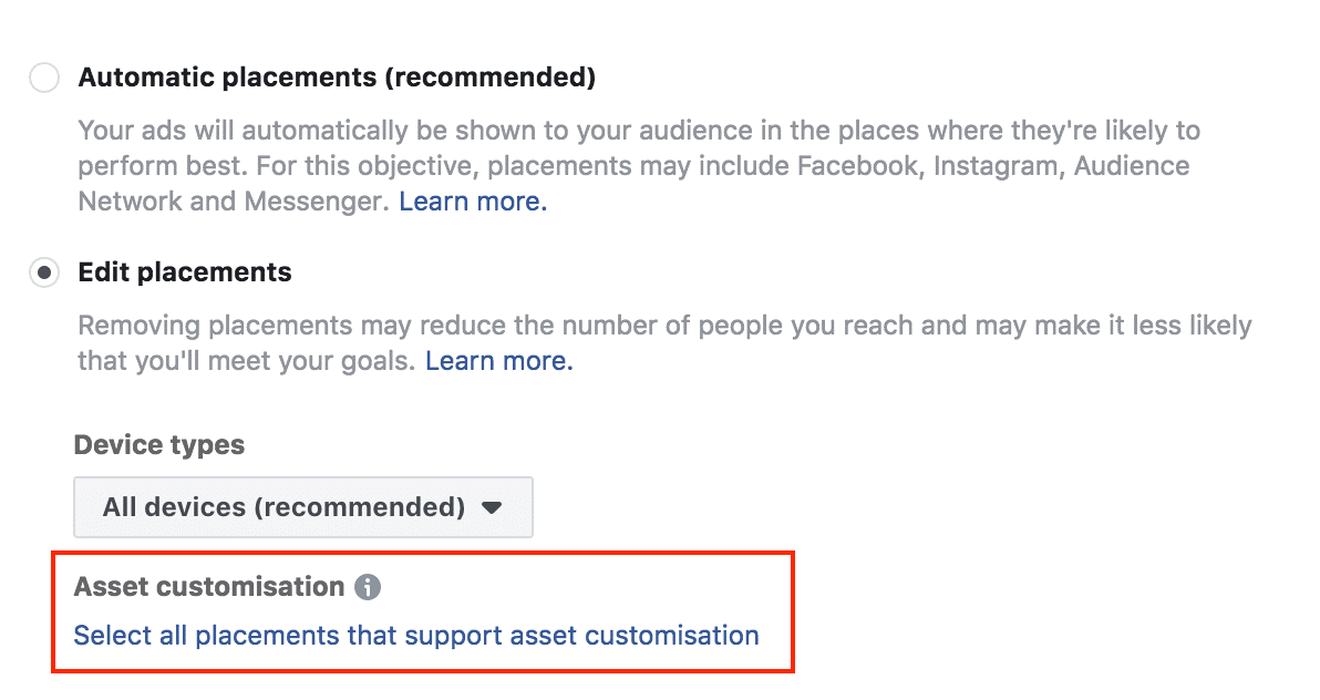 Ko pripravljate oglas, poskrbite, da bo prilagojen za različne postavitve. Med ustvarjanjem oglasne skupine lahko izberete možnost, ki vam omogoča prilagajanje izgleda oglasov (Select all placements that support asset customization).