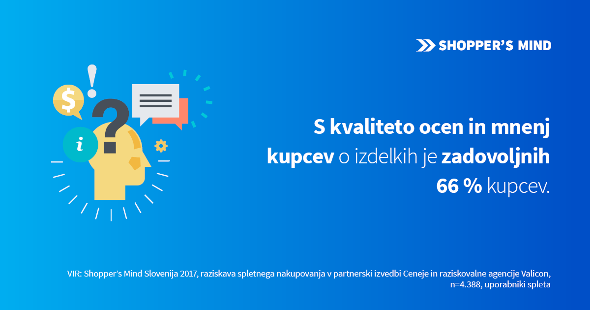 Ne le, da smo ugotovili, da 6 od 10 internetnih uporabnikov že redno nakupuje preko spleta, sodeč po raziskavi Shopper’s Mind Slovenija, je kar 66 % spletnih kupcev zadovoljnih s kvaliteto ocen in mnenj kupcev o izdelkih v spletni trgovini.